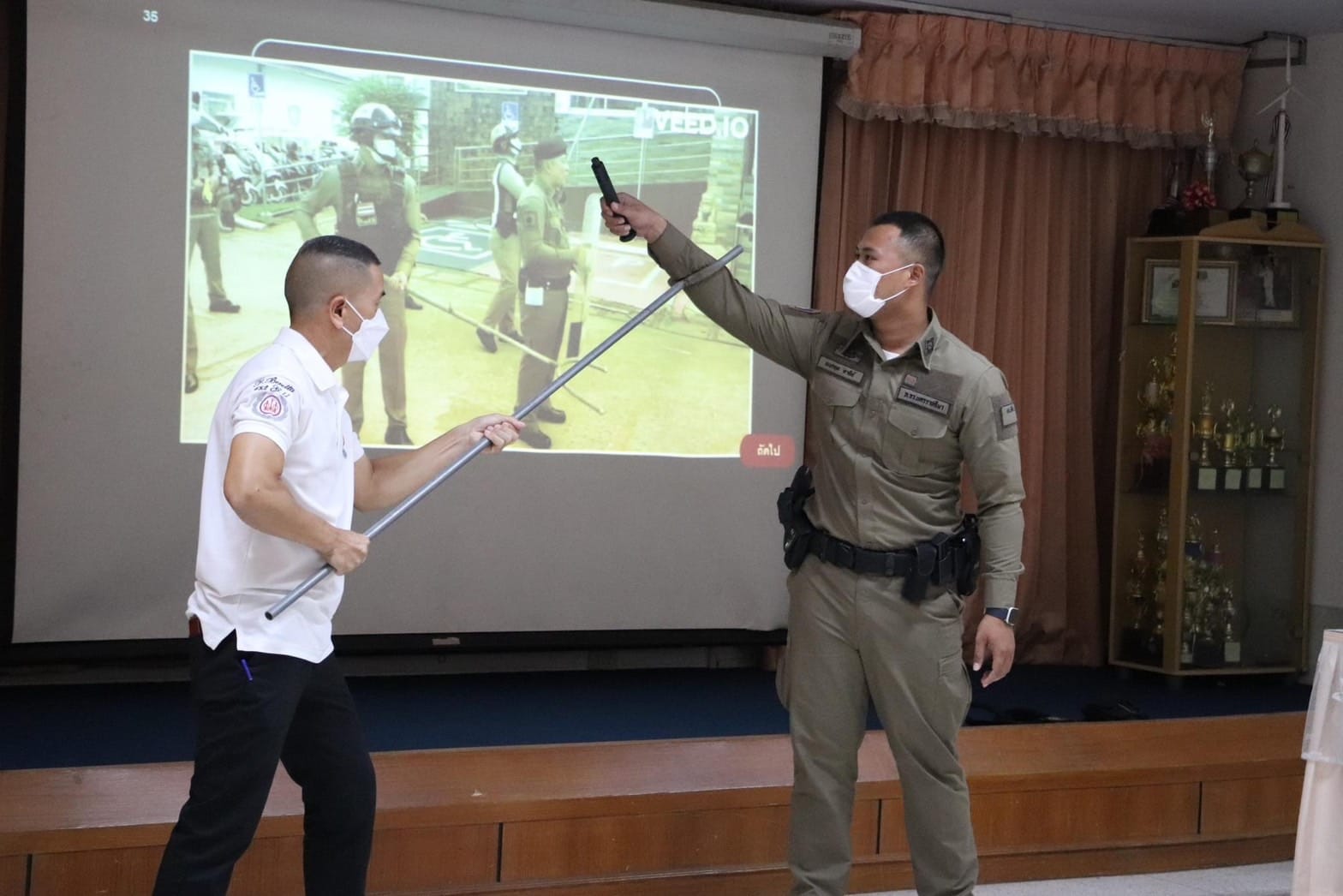 วันที่ 12 พ.ค. 2566 เวลา 14.00 น. ร.ต.อ.สุทธิ ฉับจันทึก รอง สวป.สภ.สีคิ้ว ร.ต.อ.วิญโญ ชุมพล รอง สวป.สภ.สีคิ้ว ส.ต.ต.ธนกฤต ตาติย์ ผบ.หมู่(ป.) สภ.สีคิ้ว บรรยายให้ความรู้ เจ้าหน้าที่ รพ.สีคิ้ว เรื่อง ระงับเหตุบุคคลคลุ้มคลั่ง และสาธิตการเข้าระงับเหตุโคยใช้อุปกรณ์ไม้ง่าม การใช้ปืนไฟฟ้า