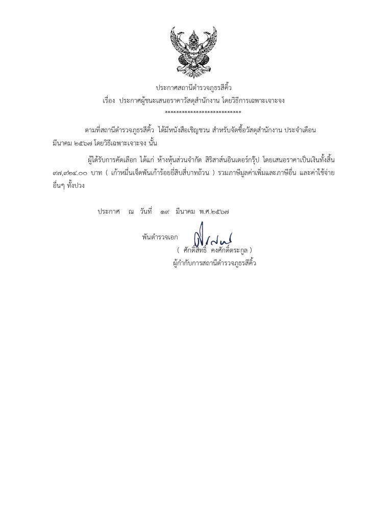 ประกาศผู้ชนะเสนอราคาวัสดุสำนักงาน ประจำเดือน มีนาคม 2567