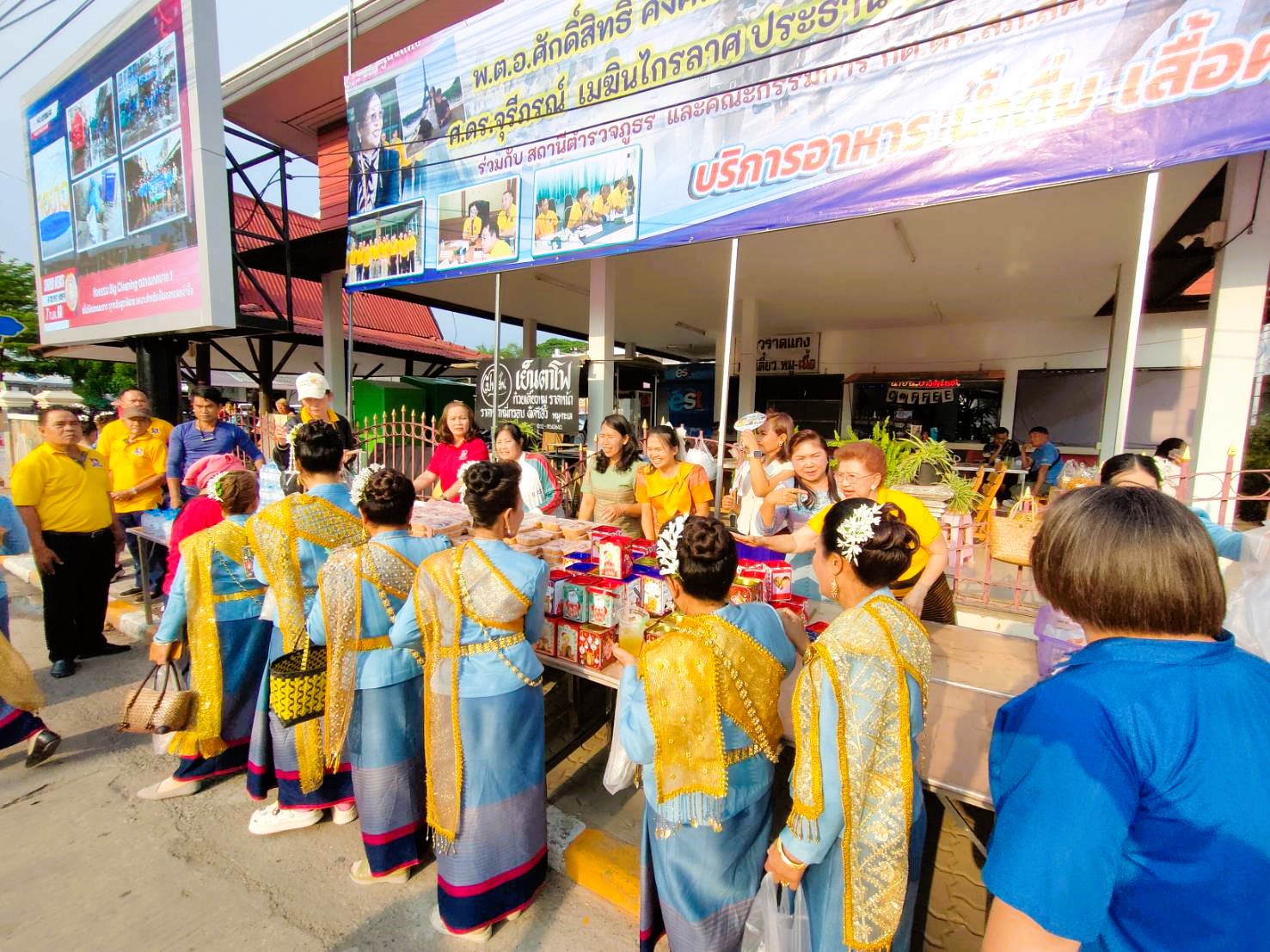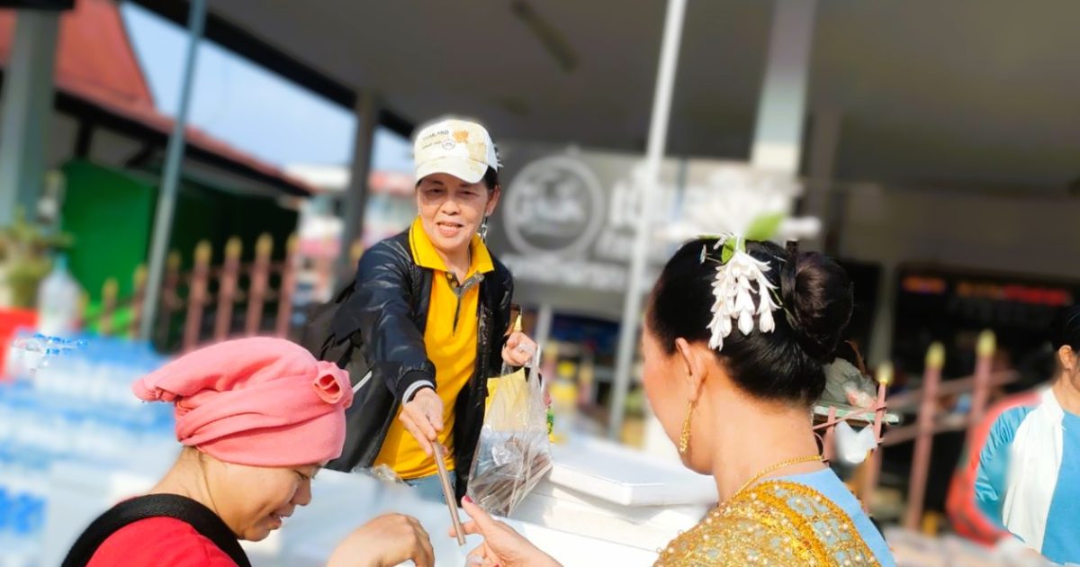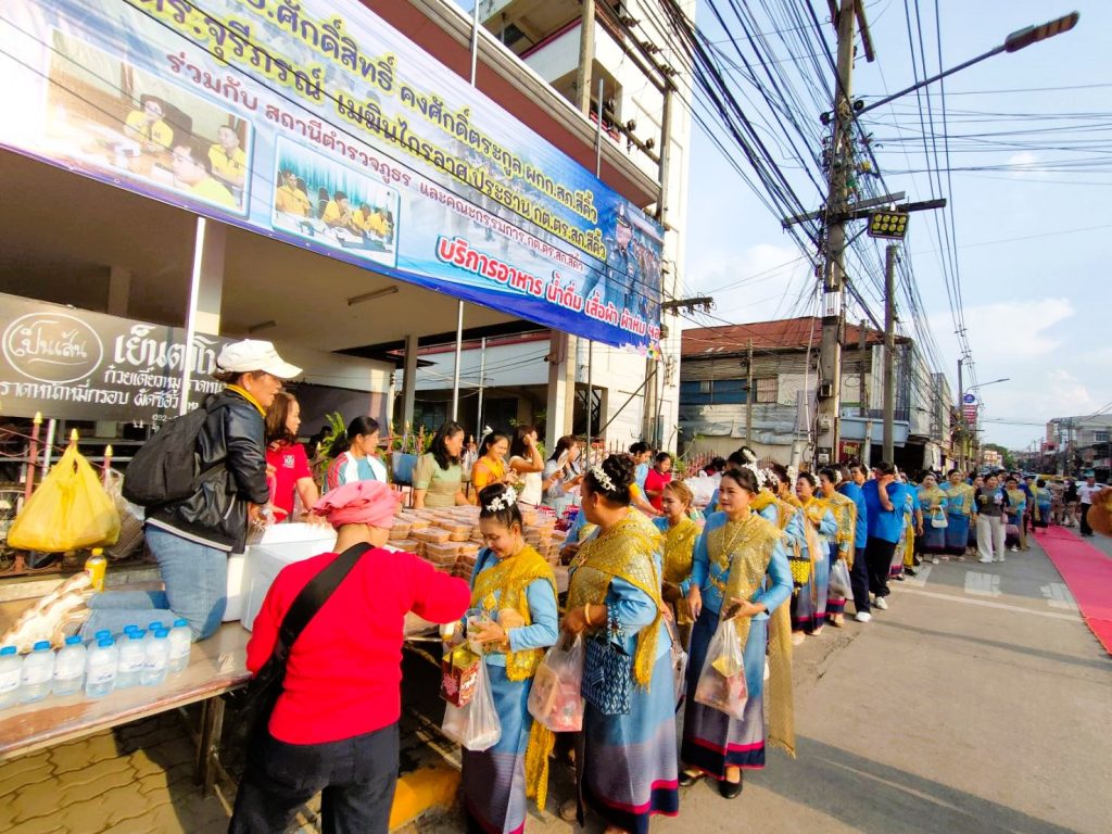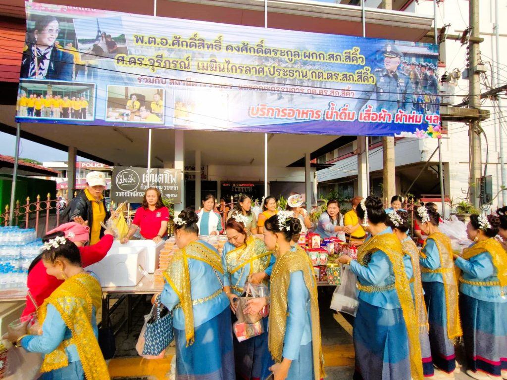 ศ.ดร. จุรีภรณ์ เมฆินไกรลาศ ประธาน กต.ตร.สภ.สีคิ้ว พร้อมคณะกรรมการ กต.ตร.สภ.สีคิ้ว พร้อมข้าราชการตำรวจ และแม่บ้านตำรวจ นำอาหารและเครื่องดื่ม แจกจ่ายให้กับนางรำและประชาชนทั่วไป ที่มาร่วมงานฉลองชัยชนะ ท้าวสุรนารี ประจำปี 2568 ณ ลานหน้าอนุสาวรีย์ท้าวสุรนารีอำเภอสีคิ้ว