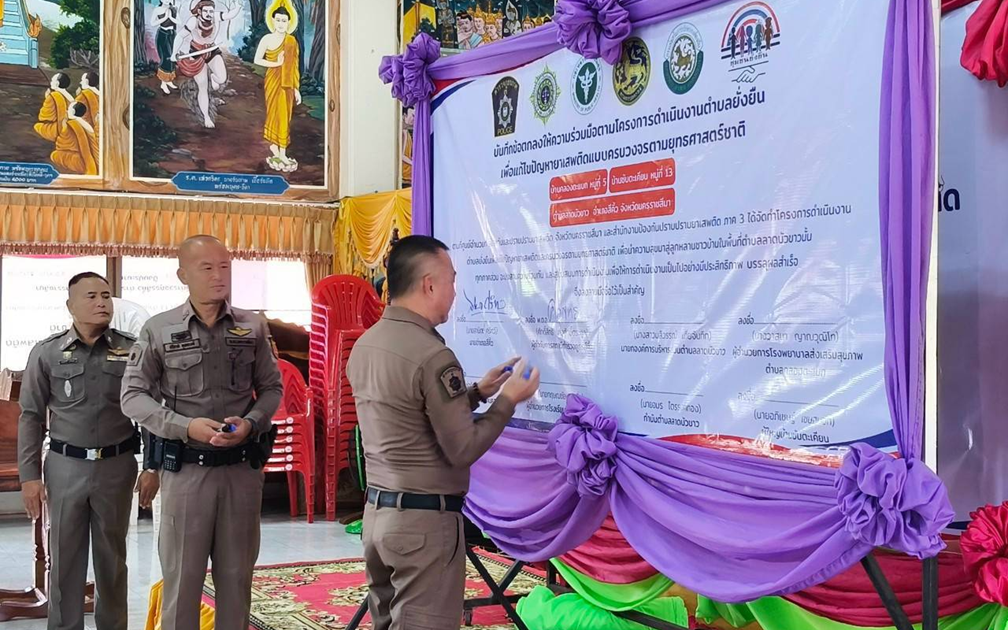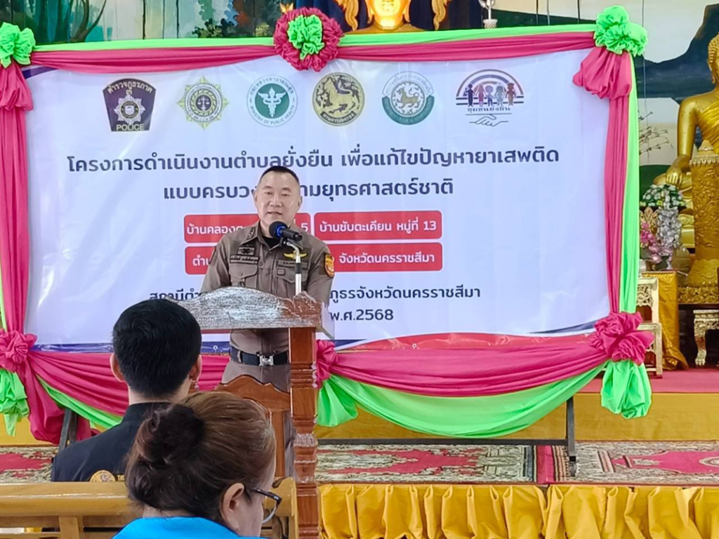 นายอมร ไตรรงค์ทอง กำนัน ต.ลาดบัวขาว นายอภิเชษฐ์ เชษฐนอก ผู้ใหญ่บ้านซับตะเคียน พ.ต.ต.กฤษณชาติ อาจอนงค์ สวป.(ชส.)สภ.สีคิ้ว พร้อมชุดปฏิบัติการชุมชนยั่งยืน เจ้าหน้าที่ อสม. / ชรบ.ฯพร้อมด้วยภาคีเครือข่ายภาคประชาชน ร่วมเปิดโครงการดำเนินงานตำบลยั่งยืนเพื่อแก้ไขปัญหายาเสพติดแบบครบวงจรตามยุทธศาสตร์ชาติ ณ วัดคลองตะแบก ต.ลาดบัวขาว อ.สีคิ้ว จ.นครราชสีมา